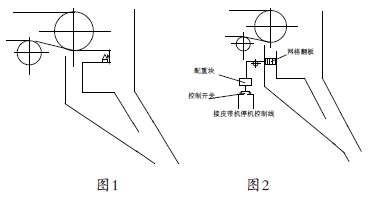 (2)為了使皮帶輸送機在溜槽堵塞后能及時停機,在副溜槽內加一個網格狀翻板(做成網格狀是防止粉塵堆積影響效果),翻板與一個杠桿相連,杠桿的另一端加一組可以調整重量的配重塊,配重塊的重量略重于翻板的重量(根據具體情況自行掌握),配重塊端與一個控制開關相連(開關的類型和型號根據具體情況選擇),使開關與輸送機的停機控制線相連接如圖2所示: