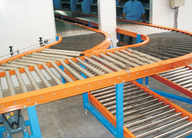 ④牽引平皮帶和輥子接觸傳動式其缺點是輸送線路不能在水平面內彎曲,另外沿線也需要足夠多的壓緊輥子,實現輥子的積放功能所需結構復雜。